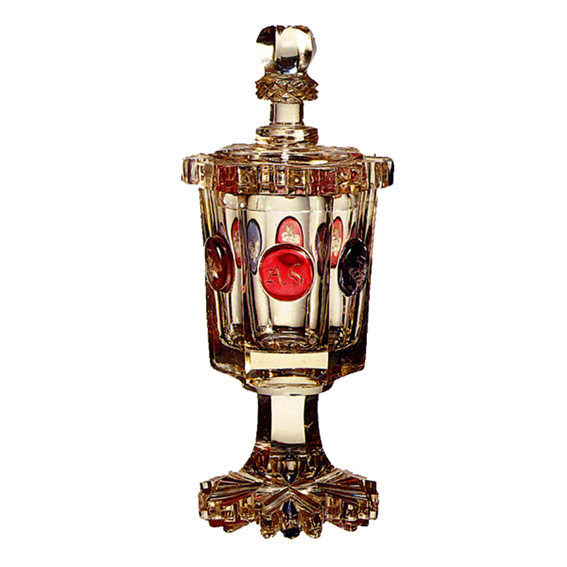 The goblet has broad smooth sides with strongly marked edges which, with the added colour of the glazed circles, seem to convey an atmosphere of peace and relaxation. Glazed glass with symbolic figures and inscriptions was often made in Bohemia in the Biedermeier period as can be seen in the holdings of the Prague Museum of Applied Art.