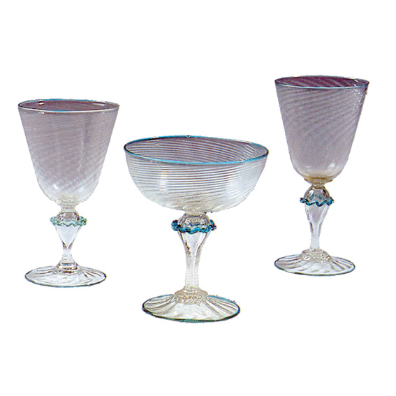 By the end of the 19th c. Venice was again mistress of the European glassware market, and its glass once more attained its former lightness, variety of shapes, perfect technique and unfettered, imaginative creativity. It continued its unrivaled tradition of forms so that glasses such as these graced many tables and showed the undimmed skill of the masters of glass-making.