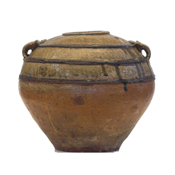 A bulging pot made of reddish clay is glazed only in the upper part of the body. Under the narrow mouth are three parallel decorative rings, in accentuated relief emphasized by the dark brown colour of the glaze. Scattered drops of glaze that melted and spilled on the surface in the process of firing can be seen on the lower part of the pot. Two handles with minute openings are attached opposite to each other between the first and the second ring so that the pot could be hung but not carried.