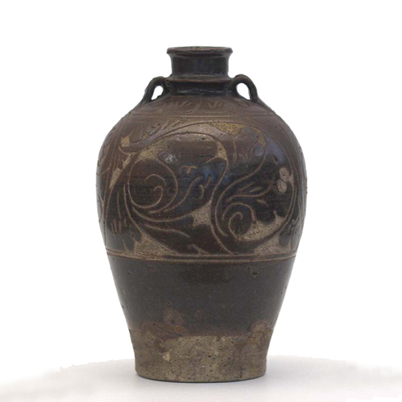 The technique of decorating ceramics applied on this bottle is called cizhou, after the name of the place where the kilns were located (Northern Song). The bottle was coated with a thick layer of brown glaze. After that a stylized phytomorphic ornament was carved. A layer of glaze was removed during the process so that after firing the unglazed parts of the body remained visible and formed an ornament. The technique was used in the north of China from the period of the Tang dynasty until the 14th c.