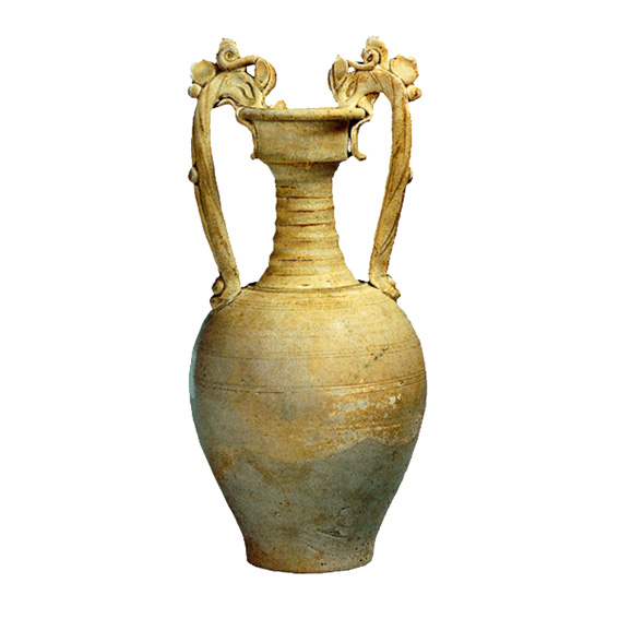 The bottle's unusual form and circular embossments on the handles are the result of the direct transformation of a metal design into ceramic form. The form originated in Persia and came to China via the Silk Road.