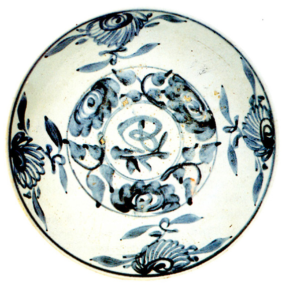 In the centre is an underglaze pattern in cobalt blue of a stylized dragon among clouds, surrounded by blossoming branches and a band of four petalled flowers within rhombs. Other even more stylized flowers are painted on the rim. Painting before glazing demanded great skill because the unfired clay immediately absorbed the colour and once a brush stroke had been made it could not be changed. For this reason patterns in underglaze colours were usually sketched in light, free strokes.