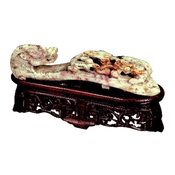 The belt buckle is carved with the narrower part ending in a little hook shaped like a dragon's head, and the wider part ending in a relief depicting two dragons playing. It belongs to the type of lute-shaped belt buckles made in bronze and jade from 6th.