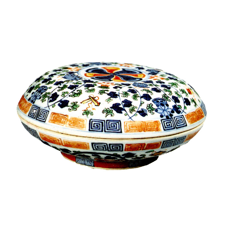A characteristic of porcelain in the reign of Emperor Wan Li was to cover the white surface with small, densely and often irregularly placed patterns in various colours. In the middle of the lid there is a large stylized flower surrounded by freely placed lotus flowers, leaves and seeds.
